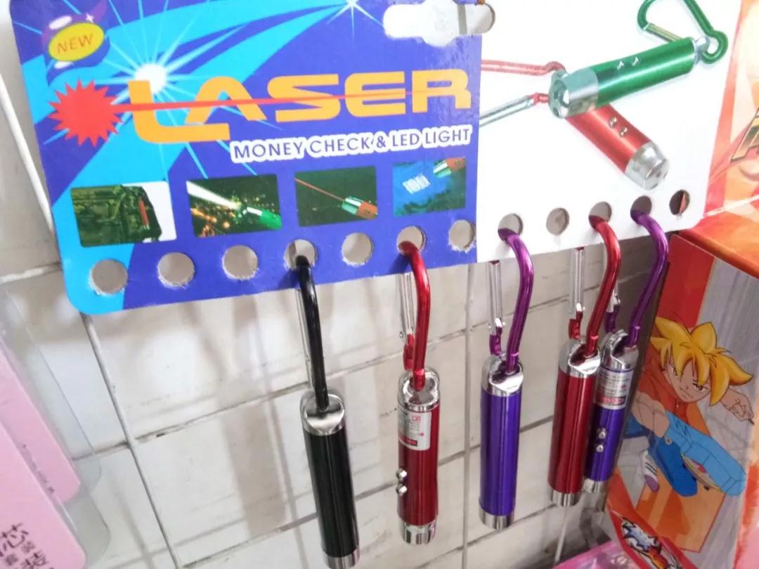 另有一家小学对面的文具店里售卖好几款激光笔,从小到大,从低端到高级。一款高级的激光笔,卖40元,除了能拉伸成杆外,还有一个小电筒,并能发散出不同图案。老板对着墙面给记者演示了一番,光束绿色,可同时发散多个光点,变幻莫测。