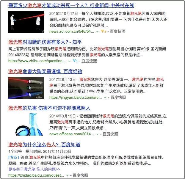 ① 激光笔的危害不容小觑,一支小小的激光笔能瞬间点燃火柴,击破气球。质检总局曾作出消费提示,指出存在较大安全隐患的儿童类产品中,激光笔位列第一,其热效应会伤害眼睛和皮肤。